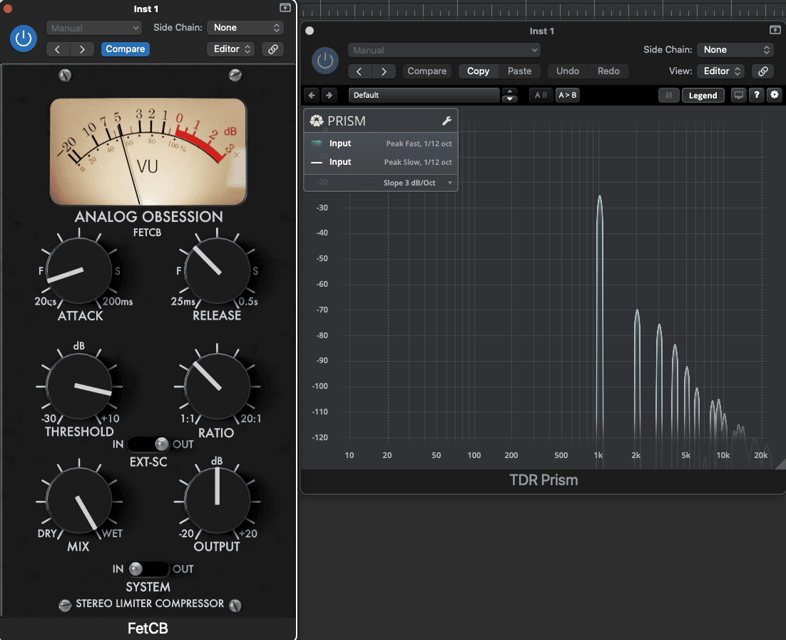 FETishを使った効果的なパラレルコンプレッション元信号とは別にFETishで強くコンプレッションした信号を作り、元信号にブレンドすることで、ダイナミクスを保ちながらパンチを追加できます。ドラムやボーカルに特に効果的です。