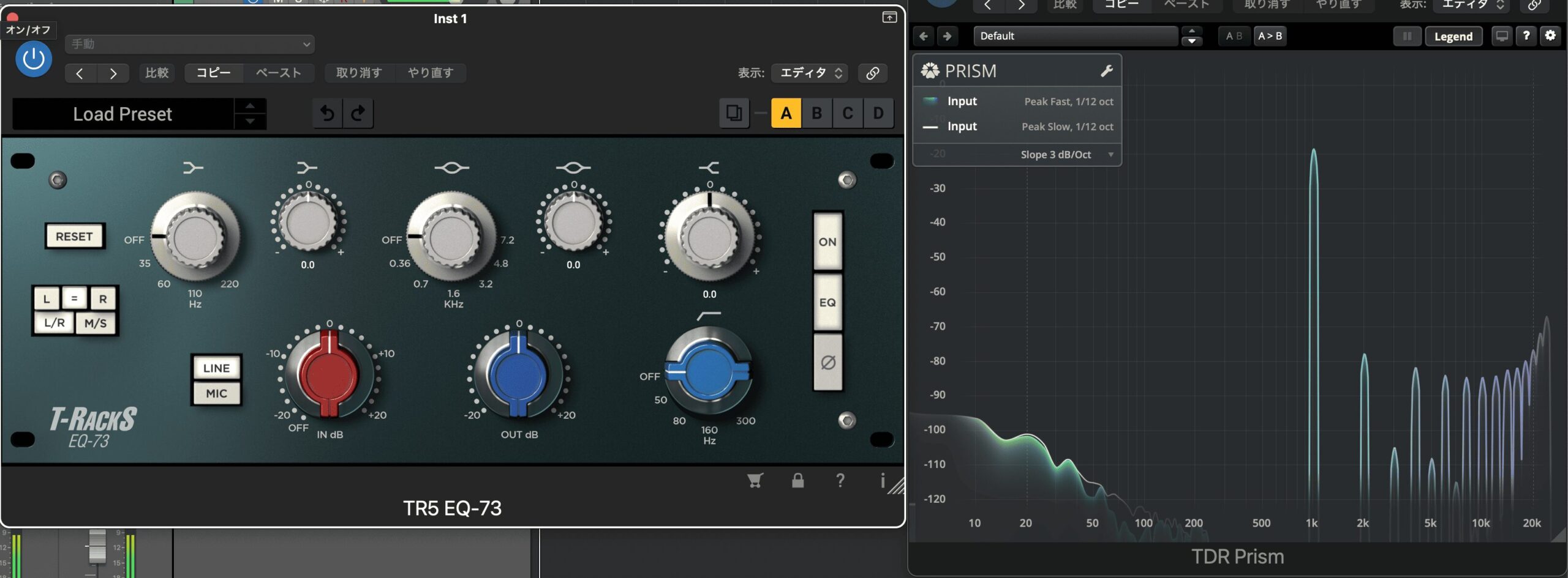 - 温かみ重視:EQP-1A → EQ-73の順番で偶数次倍音を重ねる